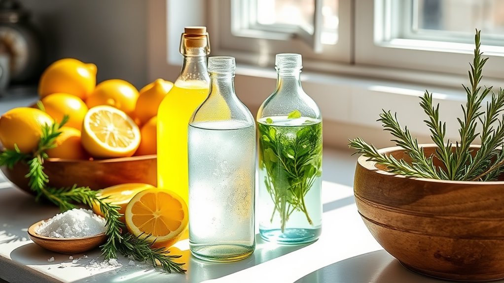 You can make your home shine with these five natural cleaning recipes that take under five minutes! Combine citrus peels and vinegar for an all-purpose cleaner. Mix baking soda with water for a quick scrub. Use equal parts vinegar and water for a streak-free glass cleaner. Create a refreshing air freshener with water and essential oils. Lastly, whip up olive oil and vinegar to polish furniture. Stick around to discover how each recipe can enhance your home!