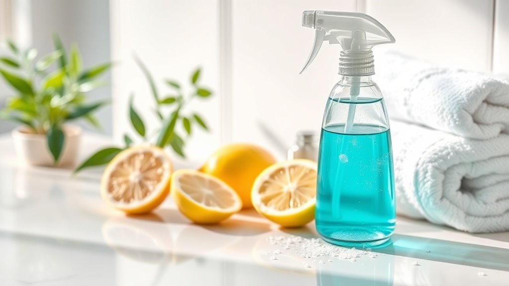 You can make an effective bathroom cleaner without bleach using white vinegar, baking soda, and lemon juice. Combine one cup of white vinegar, half a cup of baking soda, and a quarter cup of lemon juice in a bowl. Stir gently until it fizzes. This eco-friendly mixture tackles stubborn stains while keeping your home chemical-free. To maintain your sparkling bathroom, establish a daily cleaning routine. There’s more to discover about effective cleaning techniques and safety tips!