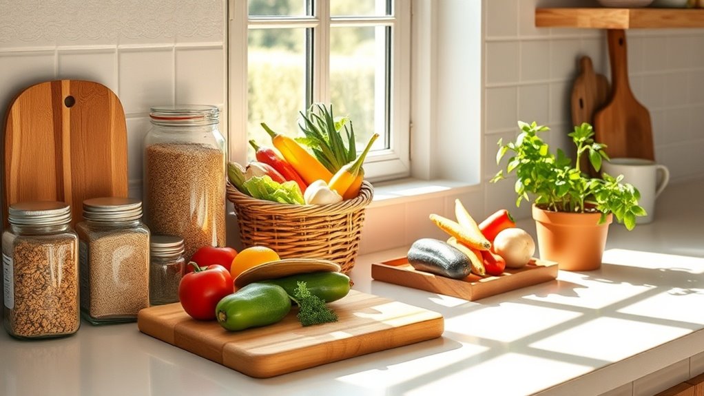 You can easily create a plastic-free kitchen while saving money with simple swaps. Start using reusable shopping bags to reduce waste and glass storage containers to keep food fresh without harmful chemicals. Beeswax wraps are a great alternative for food storage, and stainless steel water bottles eliminate single-use plastics. Don’t forget cloth napkins and wooden utensils, which add elegance and durability to your dining experience. Stick around to discover more tips for an eco-friendly kitchen transformation.