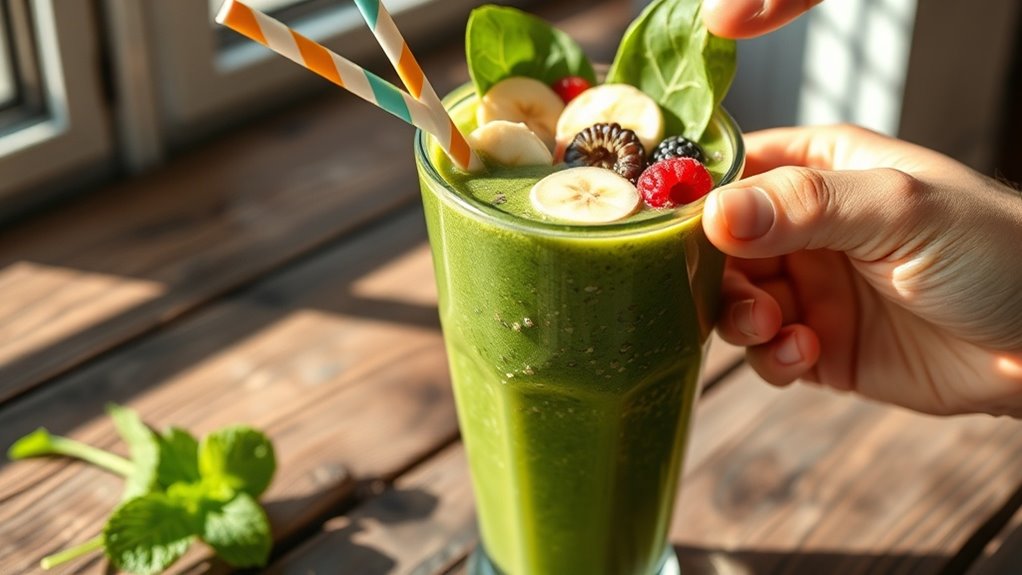Don’t forget to include healthy fats, like avocado or flaxseeds, for better nutrient absorption. Adding nutrient-dense ingredients like leafy greens can significantly enhance your smoothie’s health benefits.